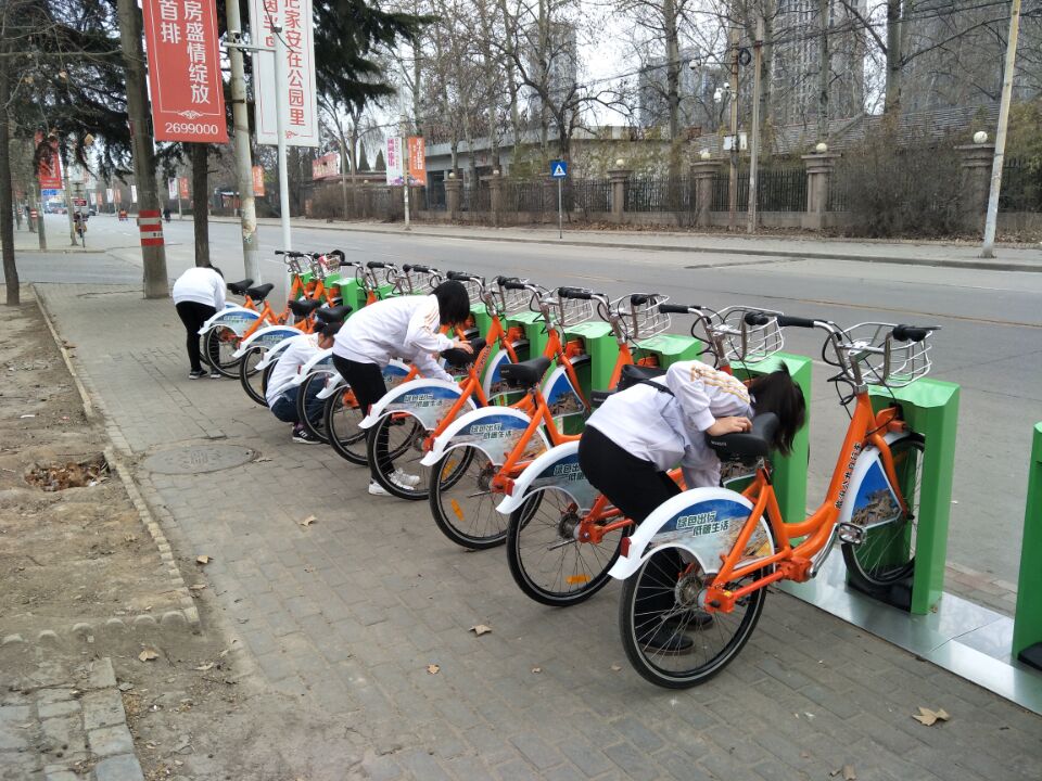 志愿者分别对尧都公园、临汾市人民政府、美特好超市、太阳成集团tyc234cc体育公司等4处站点的公交自行车、驻锁以及停靠设施进行了全面的清洁。志愿者们带着毛巾和水等清洁工具,在不影响市民租赁的情况下,对自行车进行仔细清洗。大家相互合作,合理分工,积极配合,从车把手到坐垫,从车身到车轮,从自行车到锁桩,同学们用心擦洗,不放过任何一个卫生死角。寒风凛冽中,志愿者们毫不退缩,积极热情地投入到清洁工作中,现场忙碌不已。经过一下午的努力,公共自行车站点的公共自行车焕然一新。同学们的工作不仅是让周边的公共自行车变得洁净,更向社会传达一种正能量:爱护公物,奉献社会,是每一个公民应尽的义务。