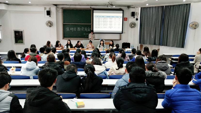 15级的七位优秀推免生依次分享保研经历,详细交流了宣讲会、夏令营、预推免和推免四个阶段的具体内容。朱怡蓉同学就申请方式、考核方式、录取比例等方面做了详细的介绍,并给大家推荐了一些实用的考研公众号;杨凯、杨晓星、姚卓雅同学分别就推免流程中的“宣讲会”、“夏令营”、“预推免”环节进行了介绍;陈博楠和闻艳飞同学向大家介绍了推免的资格和条件,尤其强调了参加各种竞赛的重要性;段霞霞同学结合几所高校的办学特色及专业概况为大家推荐了一些可供选择的高等院校。