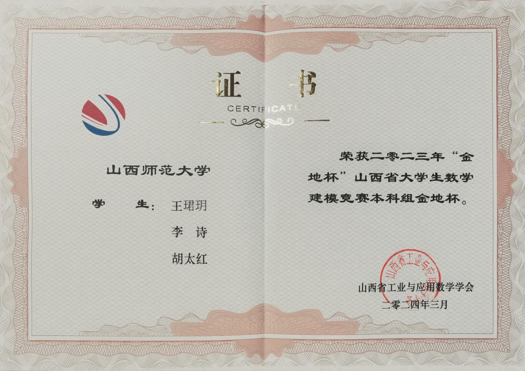 3月23日,2023“金地杯”山西省老员工数学建模竞赛颁奖仪式在晋中师范高等专科公司成功举办。本次比赛共有来自全省55所高校的1384支队伍参赛,公司2001班王珺玥、李诗、胡太红三位同学在周正勇老师的指导下荣获2023年山西省老员工数学建模竞赛本科组金地杯(金地杯为本次比赛的最高奖。)