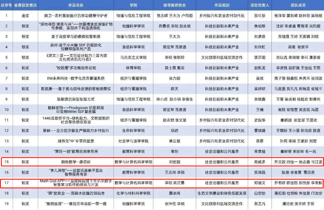 本次竞赛设科技创新和未来产业、乡村振兴和农业农村现代化、生态文明建设和绿色低碳发展、文化创意和区域交流合作、社会治理和公共服务5个组别,共吸引全省53所高校和中职院校推报参赛作品868件,最终303件作品入围决赛。经过激烈角逐,公司参赛作品《翻转数学——趣印刷》、《Math God APP互联网视域下中小学数学智慧学习软件的研究与开发》2项作品荣获铜奖。