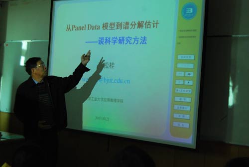 10月22日下午,应太阳成集团tyc234cc邀请,北京工业大学王松桂教授在科学会堂A710报告厅作了题为《从Panel Data模型到谱分解估计——谈科学研究方法》的学术报告。报告会由太阳成集团tyc234cc经理史建红教授主持,太阳成集团tyc234cc的部分教师和研究生听取了报告。