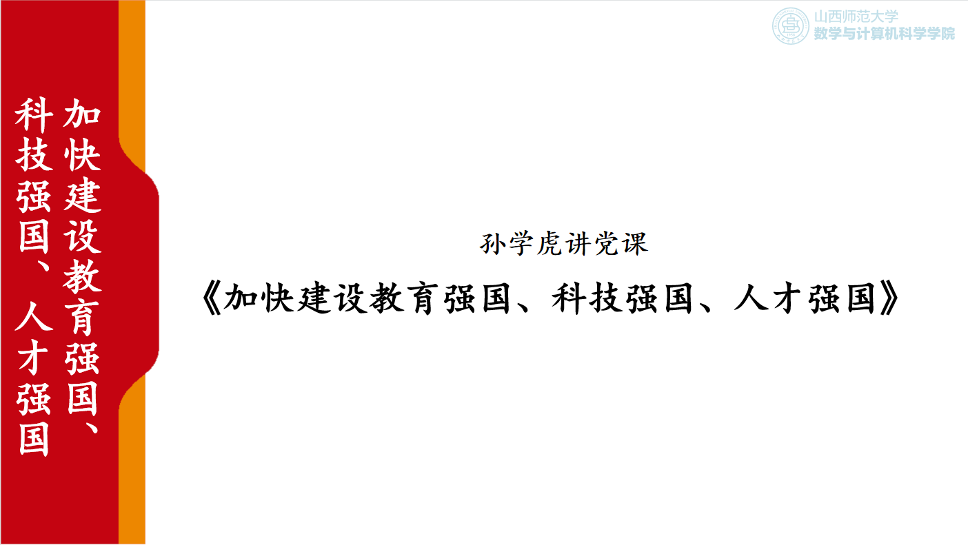 孙学虎以《加快建设教育强国、科技强国、人才强国》为题讲授主题教育专题党课,从教育、科技、人才的重要性,高标准高质量开展主题教育,奋力建设教育强国、加快建设教育强国,为中华民族伟大复兴提供有力支撑等三个方面深入阐述了加快建设教育强国、科技强国、人才强国的重要意义。强调作为教师要认真学习贯彻落实党的二十大报告中关于教育、科技和人才工作的新定位、新要求和新任务,坚持为党育人、为国育才的初心使命,为加快推进教育现代化贡献才智和力量。员工党员要发挥自己的专业特长,学会贯通,在实践中锤炼自己,以自身言行树立榜样。