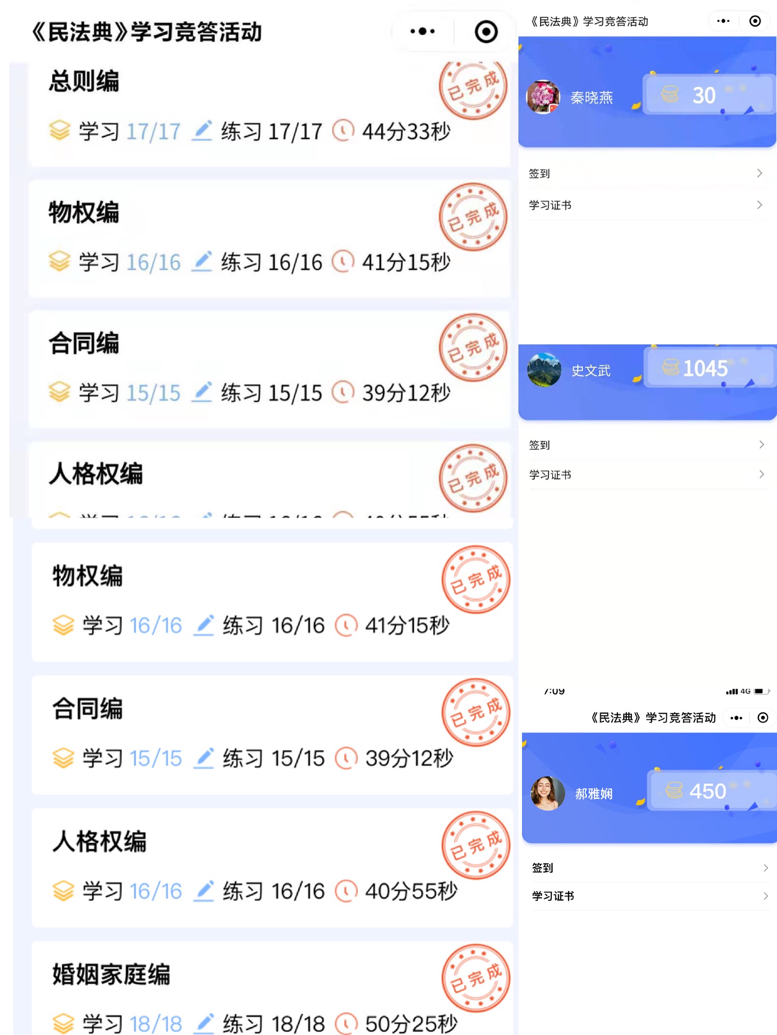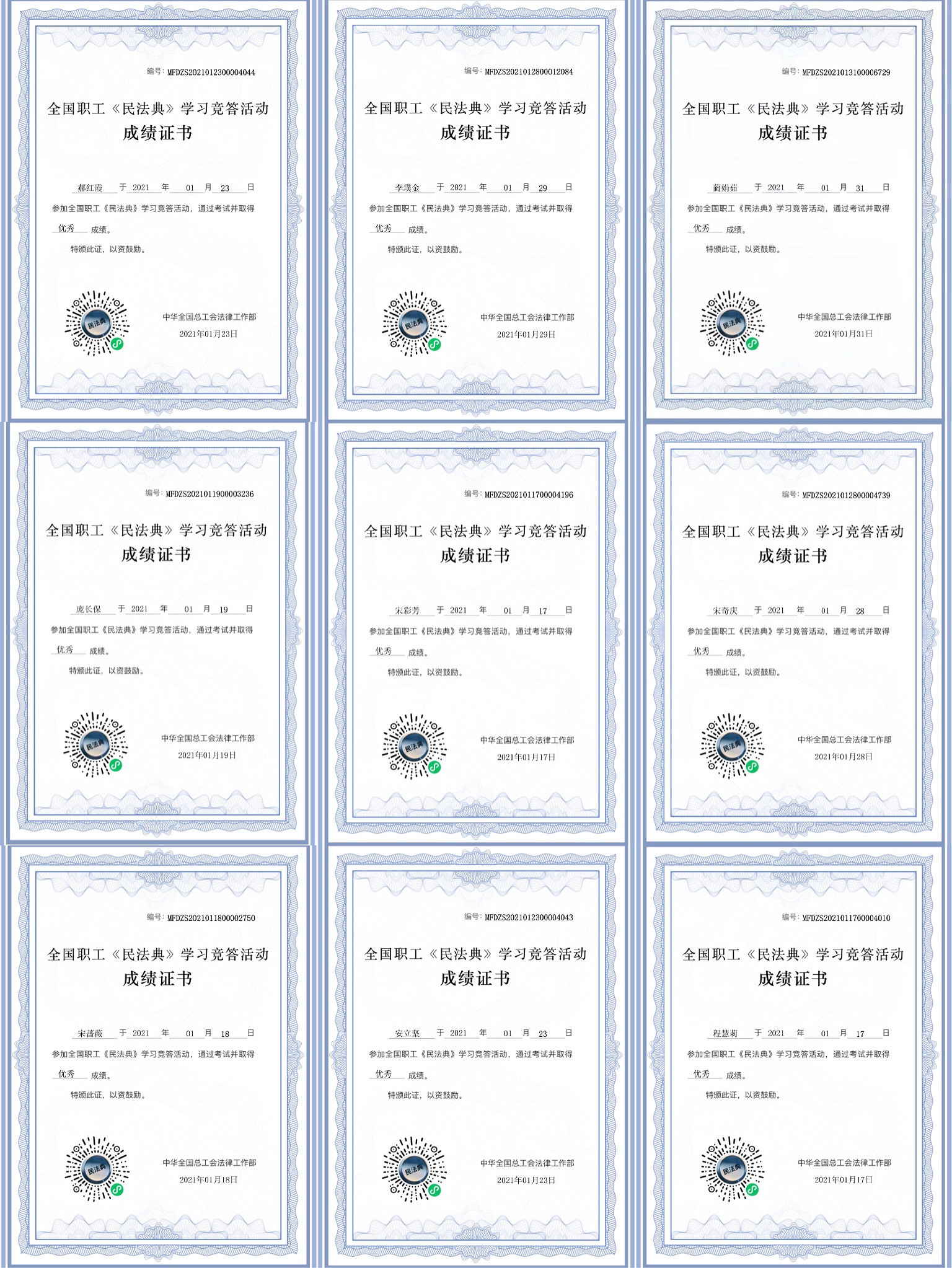 全院102名教师全部参加了学习活动,参与率100%,共有99位老师顺利通过“全国职工《民法典》学习竞答活动”获得了成绩证书,其中有35名老师获得“优秀”,优秀率35.35%。通过学习,公司教职工纷纷表示收获颇多。