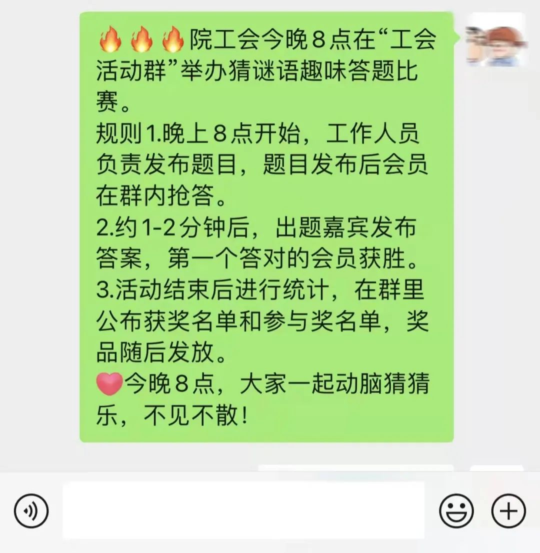 阳春三月,乍暖还寒中,太阳成集团tyc234cc的女教工们又迎来了一年一度的“三八妇女节”。为庆祝“三八”女神节,院工会于3月7日晚8时举行线上猜谜语趣味答题比赛。