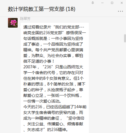 近日,按照公司党委组织部的安排,我支部党员自行观看了“百集建党纪录片”《我们的党支部---响亮全国的236党支部》,并在支部群里进行了体会发言和交流讨论。